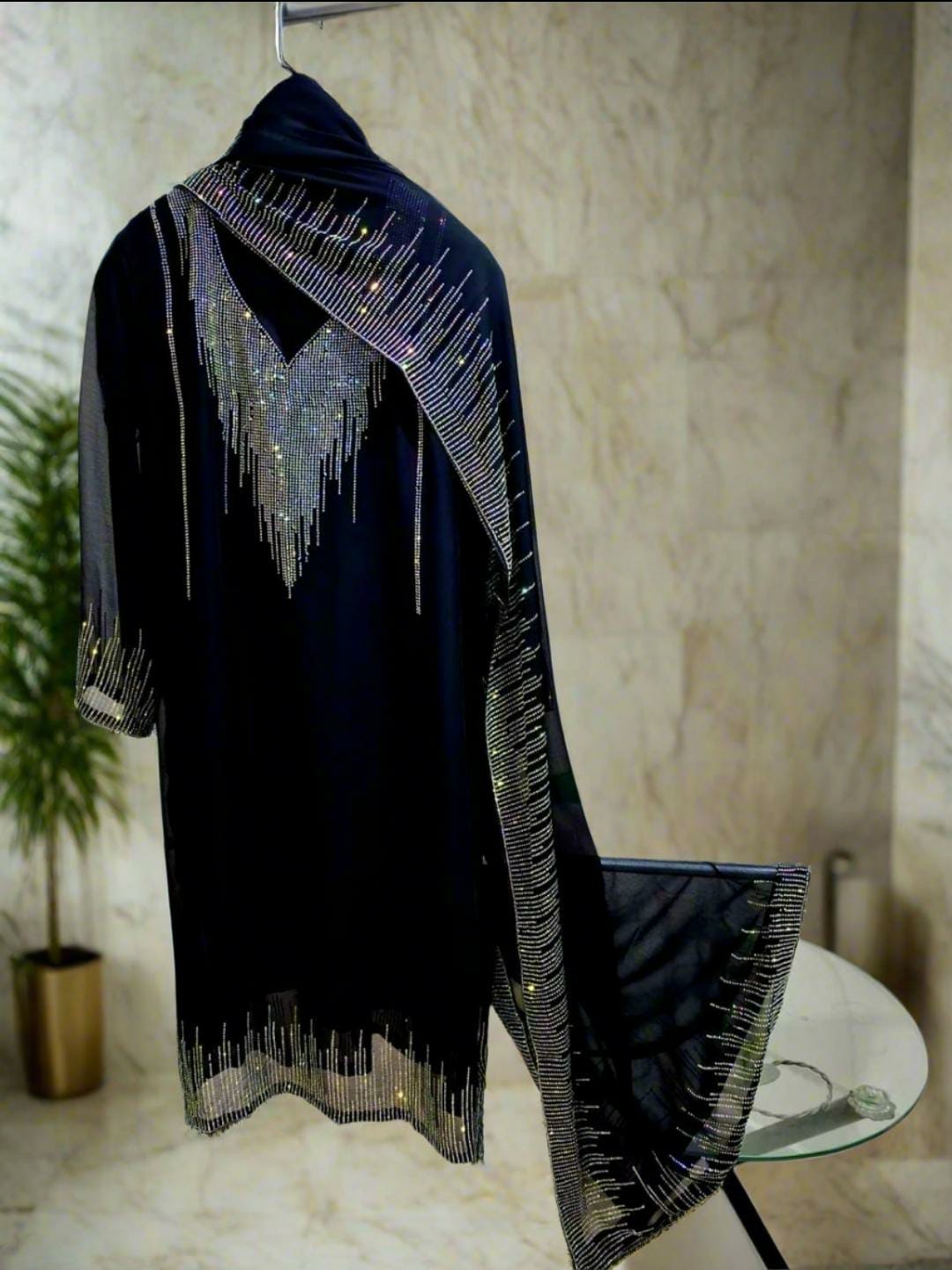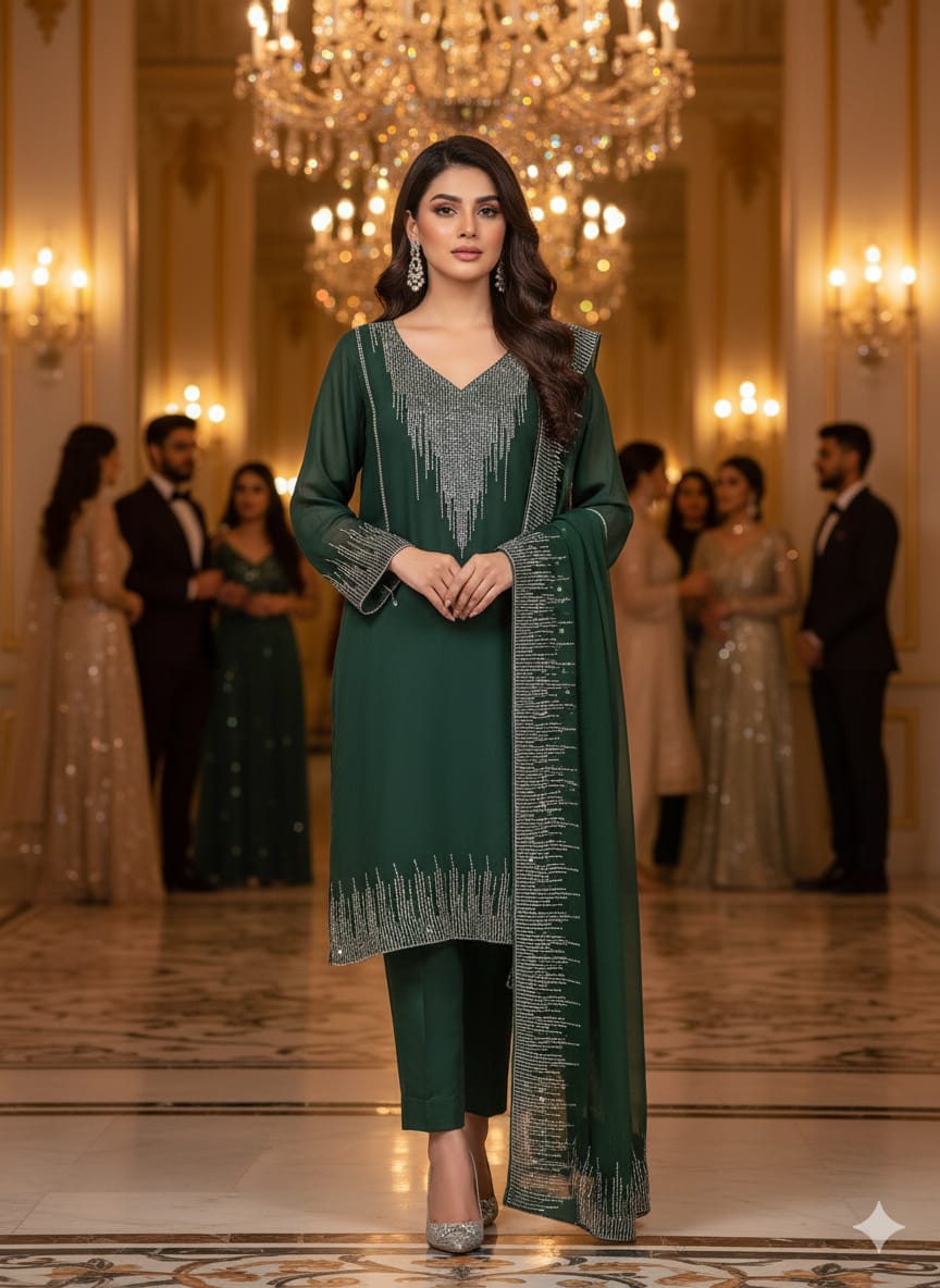 Make a stunning impression with this luxurious 3-piece Chiffon Suit, crafted for elegance and adorned with exquisite Arabic stone work.
