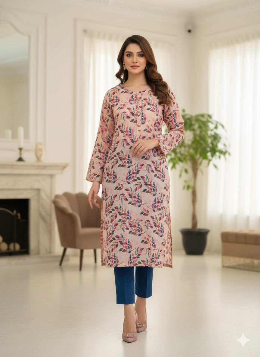 Stay cool and stylish with this 2-piece lawn suit, perfect for everyday wear or casual outings. Crafted from breathable lawn fabric, this medium-sized ensemble offers both comfort and elegance.