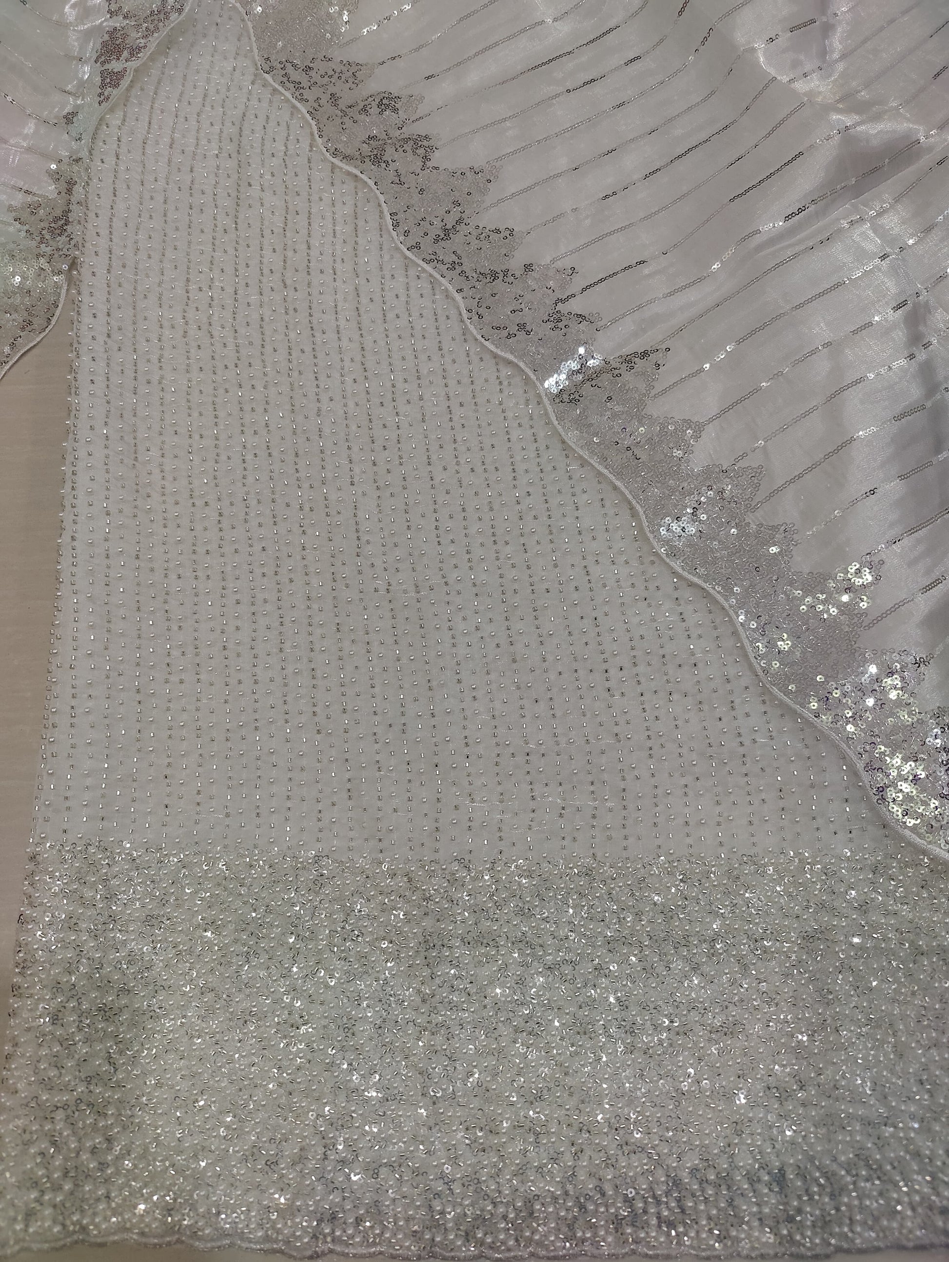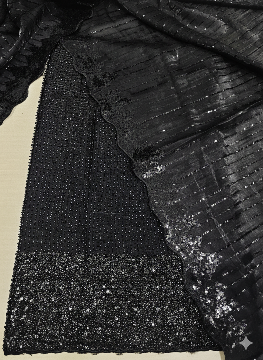 Elevate your festive wardrobe with this 2-piece unstitched ensemble, crafted from premium Korean silk and adorned with intricate Turkish Cutdana handwork. The rich texture and artisan detailing make it a standout choice for formal occasions, weddings, or evening wear.